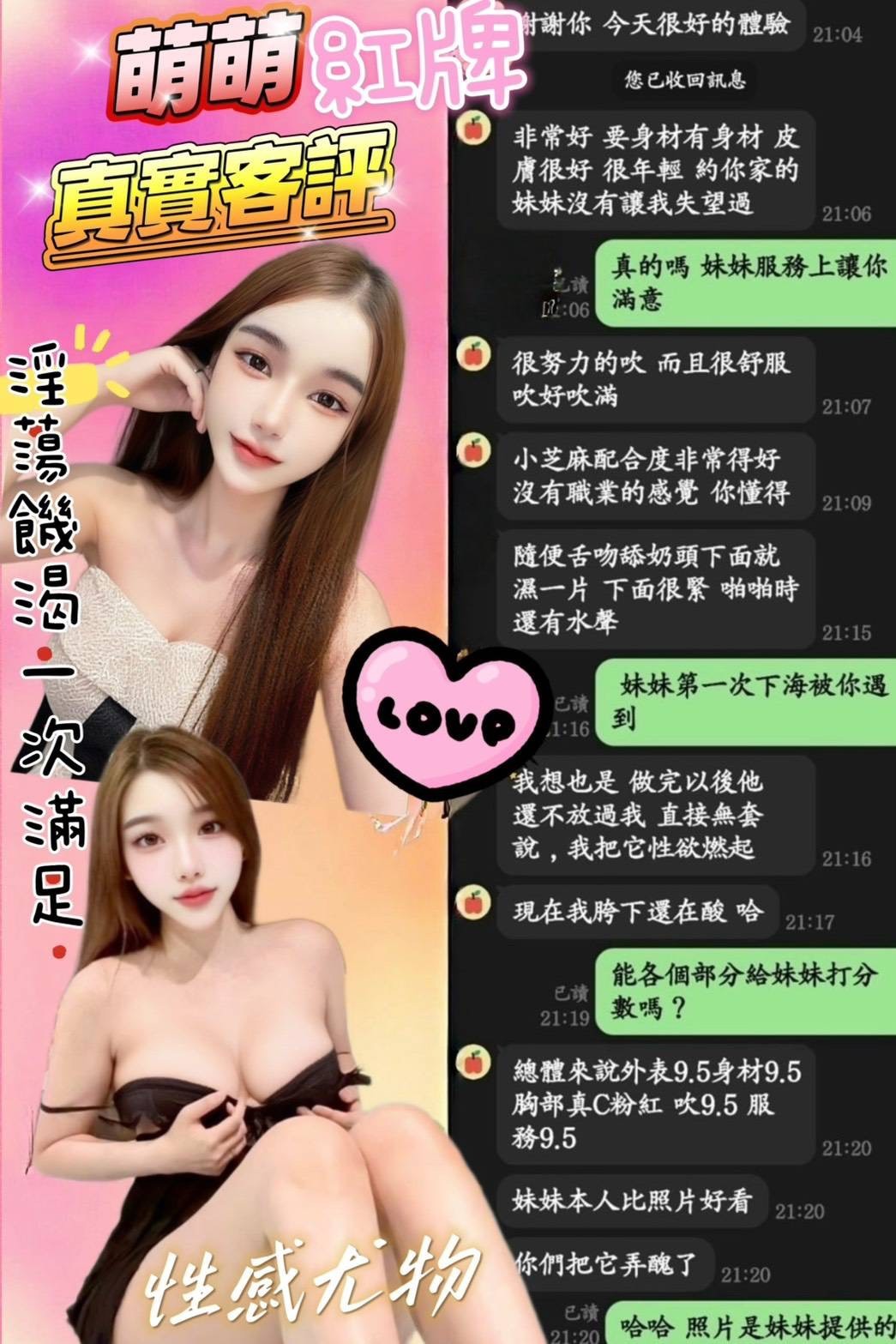 舌吻(視口腔衛生)/調情共浴/無套吹/奶炮/品苞/艷舞/自慰秀/絲襪(客自備)/按摩