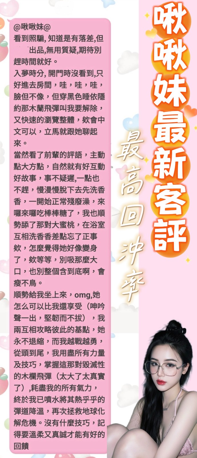 服務項目:共浴/無套吹/舌吻(視口腔清潔)/小親親/按摩/乳交/胸磨臉/品鮑/69/…