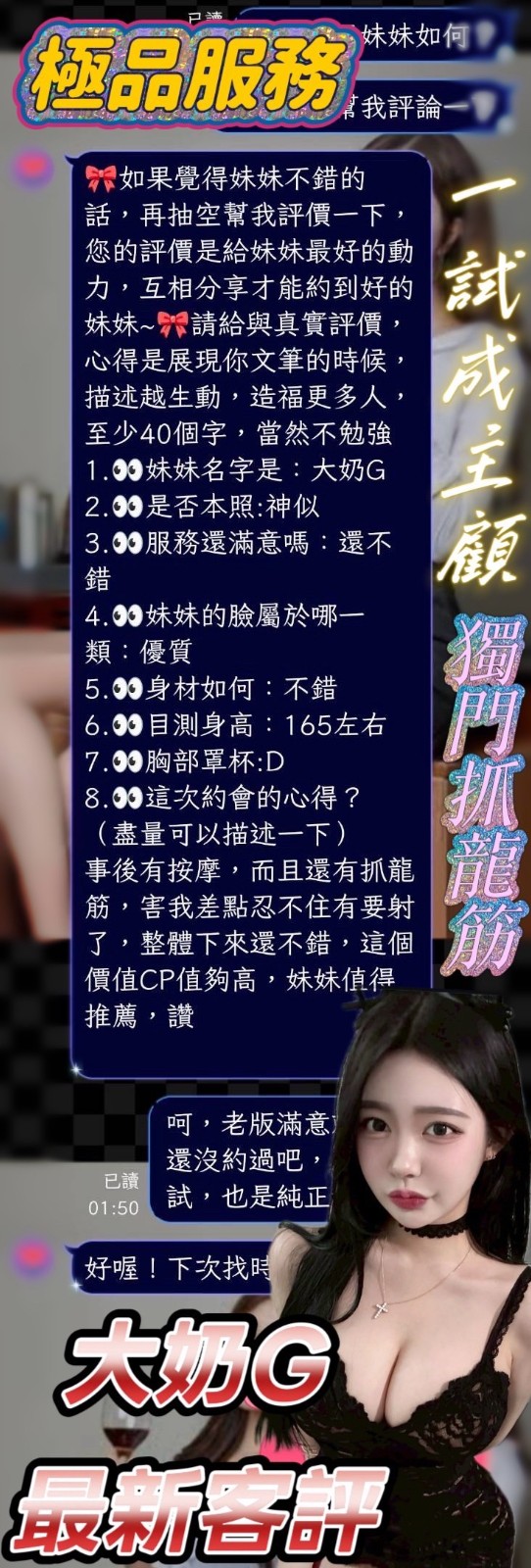 服務項目:共浴/無套吹/舌吻(視口腔清潔)/小親親/按摩/乳交/足交/舔蛋/品鮑/69/角色扮演(性感內衣)…